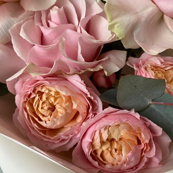 Нежный букет с кружевными и пионовидными кустовыми розами. Ароматные ветки эвкалипта добавляют букету оригинальности.